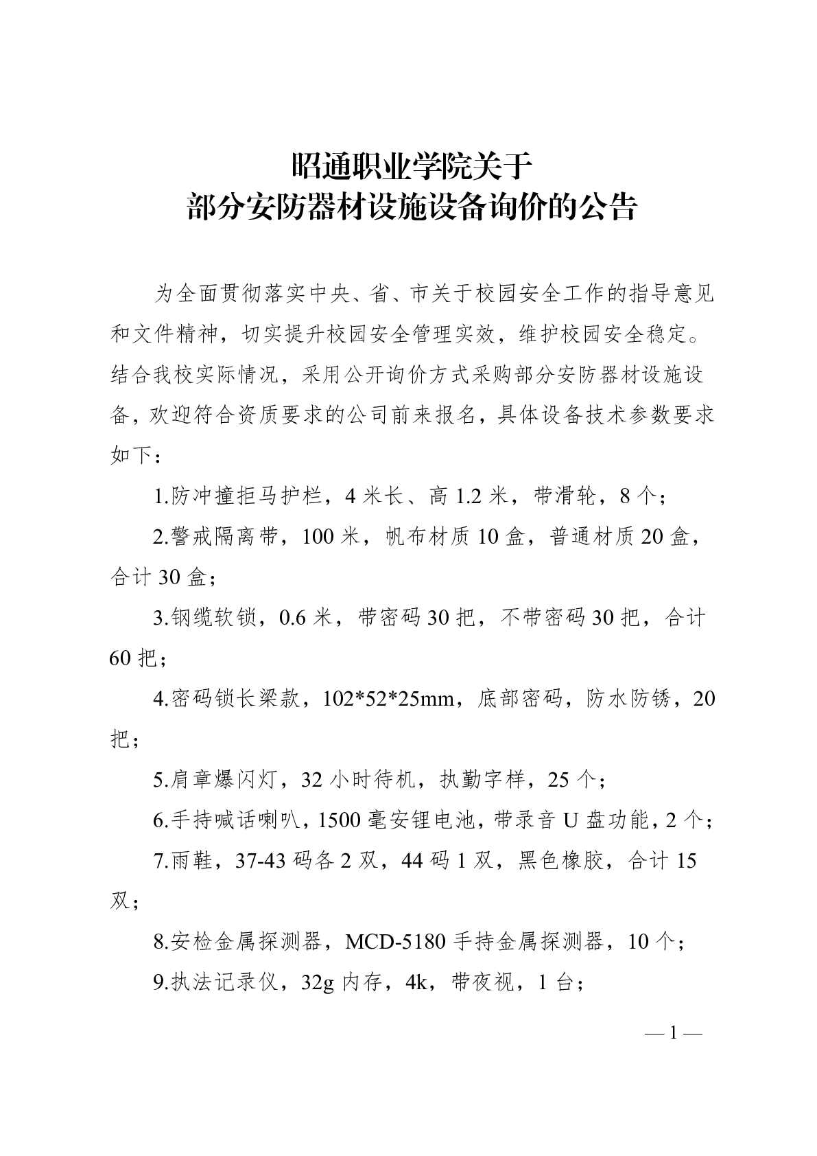昭通职业学院关于部分安防器材设施设备询价的公告
