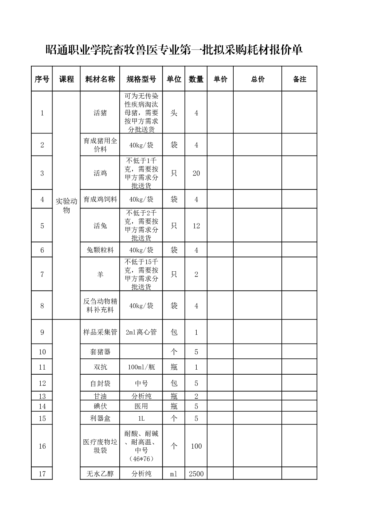 昭通职业学院畜牧兽医专业第一批耗材采购公告